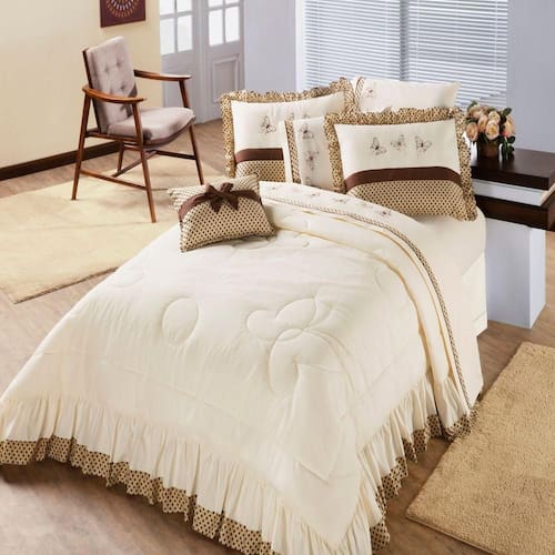 Kit Enxoval Queen Naturale Palha E Tabaco Enxovais Aquarela 5 Peças A Linha Naturalle é classica e muito delicada com sua composição de cores leves com poá e detalhes em bordado são um charme à parte. Possui edredom com detalhes bordado e babados em pó na barra, porta travesseiro com detalhes em bordado e poá com babados e almofada em poá com laço. Confeccionado em Tecido Superior 150 Fios em 80% algodão e 20% em Poliéster, Tecido Inferior em 100% Poliéster e Enchimento em 100% Poliéster.Composição: 01 Edredom 2,60m x 2,45m02 Porta Travesseiros 70cm x 50cm01 Capa de Almofada 50cm x 35cm01 Refil Almofada 50cm x 35cmTamanho - Queen Ean: 7899792208663