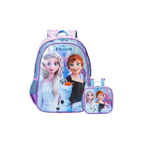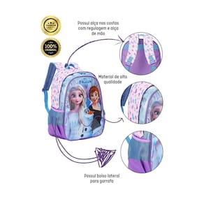 Design exclusivo Frozen com detalhes holográficos: Um show de brilho e magia para as pequenas fãs. Mochila de costas: Conforto e estilo, com alças acolchoadas e reguláveis. Lancheira: Com forro térmico é ideal para guardar lanches e bebidas mantendo a temperatura, com alça regulável. Zíper resistente: Garante maior durabilidade e segurança em todos os itens. Bolsos laterais: Ideais para guardar garrafinhas ou outros objetos pequenos. Alça de mão: Facilita o transporte da mochila e da lancheira.