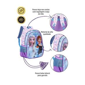 Design exclusivo Frozen com detalhes holográficos: Um show de brilho e magia para as pequenas fãs. Mochila de costas: Conforto e estilo, com alças acolchoadas e reguláveis. Lancheira: Com forro térmico é ideal para guardar lanches e bebidas mantendo a temperatura, com alça regulável. Zíper resistente: Garante maior durabilidade e segurança em todos os itens. Bolsos laterais: Ideais para guardar garrafinhas ou outros objetos pequenos. Alça de mão: Facilita o transporte da mochila e da lancheira.