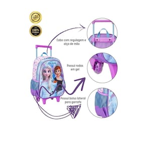 Kit Escolar 2 Peças Frozen O reino de Arendelle chegou à sua escola Com este kit Frozen completo, sua pequena aventureira poderá levar a magia de Arendelle para a sala de aula. A mochila com rodinhas, a lancheira prática, todos personalizados com as irmãs Elsa e Anna, farão a alegria das fãs do Frozen. Principais características: Design exclusivo Frozen: Com as princesas Elsa e Anna em destaque, esse kit é um sonho para qualquer fã. Mochila de rodinha com ajuste de altura: Facilita o transporte dos materiais escolares e proporciona mais conforto para a criança, adaptando-se ao tamanho da criança. Lancheira: Com forro térmico é ideal para guardar lanches e bebidas mantendo a temperatura, com alça regulável para maior conforto. Zíper resistente: Garante maior durabilidade e segurança em todos os itens. Bolsos laterais: Ideais para guardar garrafinhas ou outros objetos pequenos. Alça de mão e de costas: Versatilidade para carregar a lancheira da forma mais confortável. Detalhes personalizados: Tornam o kit ainda mais especial e único. Por que escolher este kit Completo e prático: Tudo o que sua filha precisa para a escola em um único kit. Design exclusivo: O Frozen é a paixão de muitas meninas e este kit traz a magia para a escola. Conforto e praticidade: Rodinhas, alças e compartimentos garantem o conforto e a organização. Durabilidade: Materiais de alta qualidade garantem longa vida útil. Perfeito para presente: Ideal para aniversários, volta às aulas ou qualquer outra ocasião especial. Em resumo, este kit Frozen é a escolha perfeita para as pequenas fãs da Disney. Com ele, a hora de ir para a escola será ainda mais divertida e cheia de magia Ideal para: Meninas fãs de Frozen: Um presente perfeito para encantar as pequenas princesas. Dia a dia escolar: Organiza os materiais escolares e torna o caminho para a escola mais divertido. Viagens e passeios: Ideal para transportar brinquedos e lanches.
