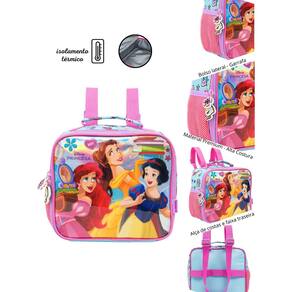 Design exclusivo: estampa das princesas e com detalhes em glitter. Fechamento por zíper: facilita o acesso ao compartimento principal. Alças de mão e costas: versatilidade para carregar da forma que preferir. Faixa de tiras adesivas: permite acoplar a lancheira na mochila. Isolamento térmico: mantém os alimentos frescos por mais tempo. Detalhes em glitter: deixa a lancheira ainda mais divertida e fashion.