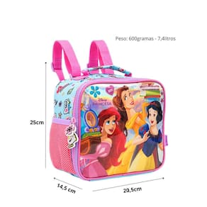 Design exclusivo: estampa das princesas e com detalhes em glitter. Fechamento por zíper: facilita o acesso ao compartimento principal. Alças de mão e costas: versatilidade para carregar da forma que preferir. Faixa de tiras aderentes: permite acoplar a lancheira na mochila. Isolamento térmico: mantém os alimentos frescos por mais tempo. Detalhes em glitter: deixa a lancheira ainda mais divertida e fashion.