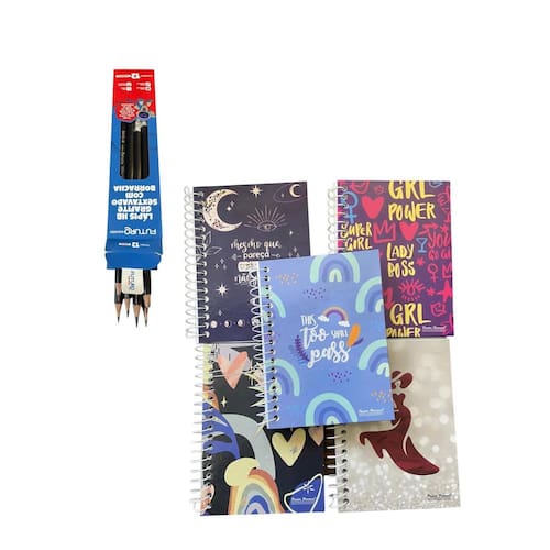 Lápis: Lápis Preto HB Sextavado com borracha CARACTERÍSTICAS DO PRODUTO Formato Sextavado. Corpo preto, mina 2,2mm, grafite 2/HB com borracha. Atóxico. Corpo sextavado. COMPOSIÇÃO Resinas e pigmentos. Cadernos: Cada caderno possui 80 folhas listradas, proporcionando um espaço amplo para anotações, desenhos e estudos. Com um formato prático de 10 cm x 14 cm, esses cadernos são perfeitos para levar na mochila ou na bolsa. A encadernação espiral garante que as folhas fiquem sempre na posição desejada, facilitando o manuseio. As capas duras oferecem resistência e proteção, enquanto os desenhos trazem um toque de criatividade e estilo. Marca: Não Informado
