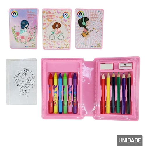 KIT Escolar 18 Peças Colorir Meninas - Mini Kit Pintura Escolar Meninas, a criança pode levar para a escola, brincar com as colegas e se divertir bastante;\n- Contém: 6 Giz de Cera, 6 Lápis de Cor, 4 Desenhos, 1 Apontador, 1 Borracha;\n- Disponível em modelos ;\nEspecificações:\nMarca : UNION\nTipo de material : Plástico, Pigmentos\nCores ou Estampa :\nDimensões do Produto : 14 X 10 X 2,5 CM\nDimensões da Embalagem : 14 X 10 X 2,5 CM\nPeso Bruto (Gramas) : 0.076 Marca: Não Informado