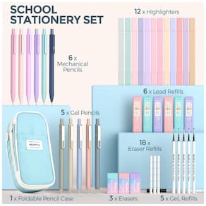 O kit escolar Nicpro 39 peças reúne em um único conjunto canetas em gel, lápis mecânicos, marcadores pastel, borrachas e grafites organizados em um estojo azul de grande capacidade. O estojo em tecido possui compartimentos e espaço interno ampliado, permitindo acomodar canetas, lápis e refis de forma organizada para uso diário em escola, faculdade ou escritório. A combinação de pontas finas e marcas-texto em tons pastel foi pensada para escrita contínua, grifos em materiais de estudo e anotações em planners e cadernos.
