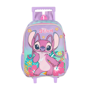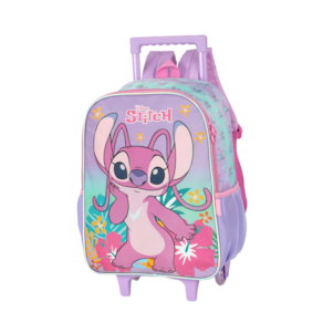 Mochila com rodinhas Angel – ampla, resistente e fácil de transportar, com alça retrátil, rodinhas reforçadas e bolsos laterais. Lancheira térmica Angel – mantém os alimentos frescos por mais tempo, com alça de mão e alça de ombro ajustável. Estojo Angel – espaçoso e prático, ideal para lápis, canetas e outros materiais escolares.