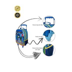 Mochila com Rodas: Confeccionada em Poliéster Fechamento em zíper 1 Compartimentos espaçoso 2 bolsos laterais para garrafa Possui RODAS e ALÇA DE MÃO Design exclusivo Medidas aproximadas: Altura: 40 cm Largura: 15 cm Comprimento: 30 cm Lancheira Térmica: Confeccionada em Poliéster Isolamento térmico Alça de mão e alça transversal Design exclusivo Fechamento em zíper Medidas aproximadas: Altura: 22 cm Largura: 8 cm Comprimento: 18 cm Estojo simples: Confeccionado em Poliéster Fechamento em zíper 1 compartimentos espaçoso Design exclusivo Medidas aproximadas: Altura: 10 cm Largura: 22 cm Comprimento: 7 cm CUIDADOS: - Guarde em um local seco e arejado evitando locais úmidos. - Evite colocar excesso de peso no produto para não forçar os zíperes e costuras. - Proteja os objetos cortantes e/ou pontiagudos evitando o contato direto com o produto. - Evitar altas temperaturas. - Cores claras poderão manchar quando em contato com outros objetos ou roupas de cores pigmentadas.