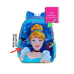 - Mochila de costas G com estampa da Cinderela e outros personagens da Disney - Produzida em poliéster resistente - Dois bolsos laterais e um frontal - Zíperes com puxadores personalizados - Dimensões: 42 x 30 x 15 cm altura x largura x profundidade