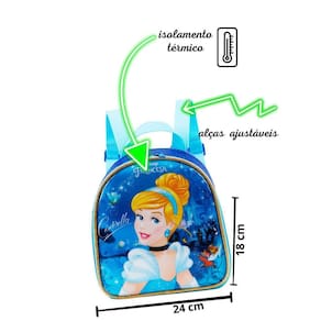 - Lancheira térmica com estampa da Cinderela - Compartimento térmico interno para manter os alimentos frescos - Alça de mão e alça como mochila - Medidas: 24x18cm