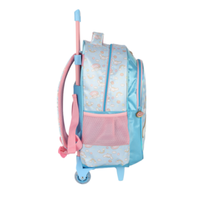 Mochila de rodinhas: Estampa exclusiva do Cinnamoroll em tons de azul e detalhes coloridos. Rodinhas resistentes e alça retrátil para facilitar o transporte. Amplo compartimento interno para livros, cadernos e materiais escolares. Bolsos laterais em tela para garrafinha ou pequenos objetos. Alças acolchoadas, possibilitando também o uso como mochila.