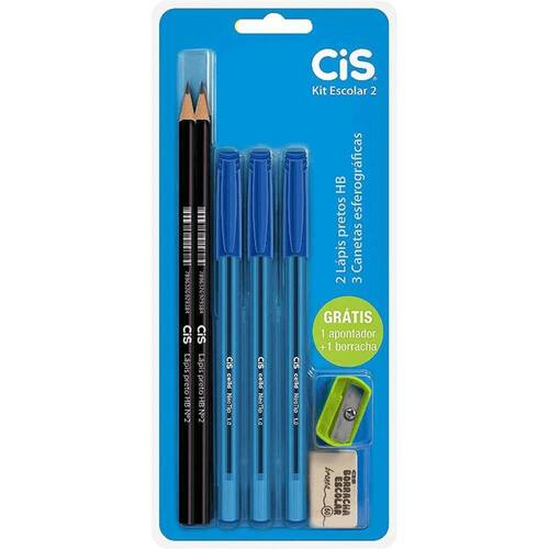 Contém: 2 lápis pretos HB, 1 borracha, 1 apontador, 3 canetas esferográficas azul.