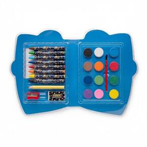 - conteúdo do estojo: 12 cores de tinta aquarela, 8 gizes de cera coloridos, 1 pincel, 1 lápis grafite, 1 borracha macia, 1 apontador
