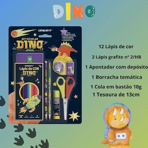 Kit EscolarDino Space 12 Lápis de Cor + Lápis Grafite Estampado + Apontador + Borracha + Cola + Tesoura - Leo&Leo