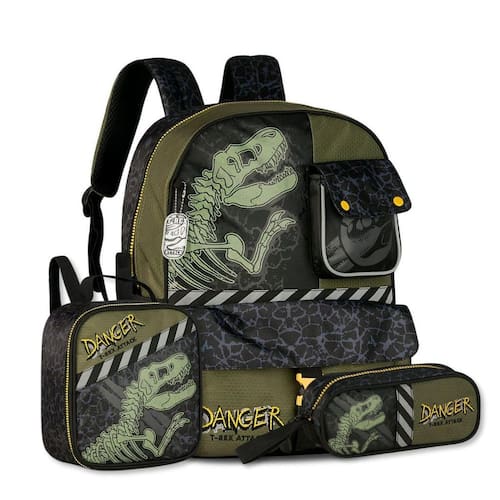 O Kit Escolar Infantil Dinossauro com Mochila de Costas, Lancheira Térmica e Estojo é a escolha perfeita para acompanhar os meninos durante a rotina escolar com conforto, organização e muito estilo. A Mochila de Costas TX25027J é confeccionada em poliéster de alta qualidade com detalhes em ripstop e possui estampa moderna de dinossauro em tons de verde. Seu compartimento principal é espaçoso e com fechamento em zíper, ideal para cadernos e livros. Conta ainda com dois bolsos frontais para manter os acessórios organizados e bolsos telados laterais para garrafinhas. Suas alças de costas são ajustáveis e acolchoadas, garantindo conforto no transporte, e a alça de mão superior traz mais praticidade no dia a dia. Acompanha chaveiro personalizado. Dimensões aproximadas: 40x30x13cm. A Lancheira Térmica TX25028L mantém os alimentos bem conservados graças ao revestimento térmico interno. Produzida em poliéster com frente em telado duplo e etiqueta de borracha, possui fechamento em zíper, alça de costas regulável, alça de mão superior e alça carona que permite acoplar diretamente na mochila de rodinhas ou malas. Dimensões aproximadas: 23x20x11cm. O Estojo TX25029E completa o kit oferecendo espaço interno para organizar todos os materiais menores, como lápis, canetas e borrachas. É confeccionado em poliéster resistente, com frente em telado duplo, puxador de zíper personalizado e design moderno de dinossauro. Dimensões aproximadas: 21x9x6cm. Esse kit é ideal para quem prefere mochila de costas, oferecendo praticidade, resistência e estilo em um só conjunto. Com estampa exclusiva e acabamento de qualidade, é perfeito para pais que procuram produtos duráveis e funcionais para a volta às aulas. Marca: Não Informado
