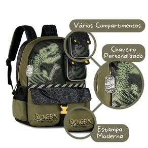 O Kit Escolar Infantil Dinossauro com Mochila de Costas, Lancheira Térmica e Estojo é a escolha perfeita para acompanhar os meninos durante a rotina escolar com conforto, organização e muito estilo. A Mochila de Costas TX25027J é confeccionada em poliéster de alta qualidade com detalhes em ripstop e possui estampa moderna de dinossauro em tons de verde. Seu compartimento principal é espaçoso e com fechamento em zíper, ideal para cadernos e livros. Conta ainda com dois bolsos frontais para manter os acessórios organizados e bolsos telados laterais para garrafinhas. Suas alças de costas são ajustáveis e acolchoadas, garantindo conforto no transporte, e a alça de mão superior traz mais praticidade no dia a dia. Acompanha chaveiro personalizado. Dimensões aproximadas: 40x30x13cm. A Lancheira Térmica TX25028L mantém os alimentos bem conservados graças ao revestimento térmico interno. Produzida em poliéster com frente em telado duplo e etiqueta de borracha, possui fechamento em zíper, alça de costas regulável, alça de mão superior e alça carona que permite acoplar diretamente na mochila de rodinhas ou malas. Dimensões aproximadas: 23x20x11cm. O Estojo TX25029E completa o kit oferecendo espaço interno para organizar todos os materiais menores, como lápis, canetas e borrachas. É confeccionado em poliéster resistente, com frente em telado duplo, puxador de zíper personalizado e design moderno de dinossauro. Dimensões aproximadas: 21x9x6cm. Esse kit é ideal para quem prefere mochila de costas, oferecendo praticidade, resistência e estilo em um só conjunto. Com estampa exclusiva e acabamento de qualidade, é perfeito para pais que procuram produtos duráveis e funcionais para a volta às aulas. Marca: Não Informado