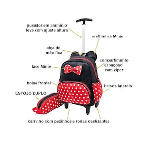 Kit Escolar Infantil Kids Laço Carrinho Estojo MC4324 Mochila Carrinho com puxador ajustável à altura da criança. Compartimento espaçoso com zíper Bolsos laterais em elásticos Bolso frontal com zíper Puxador em alumínio Carrinho com rodas deslizantes e pezinhos de apoio Acompanha estojo duplo Medidas aproximadas em cm: AxLxP 34x18x28 Altura máxima do puxador com 60cm Detalhes de orelhinhas e laço poá Ean: 0789356471534
