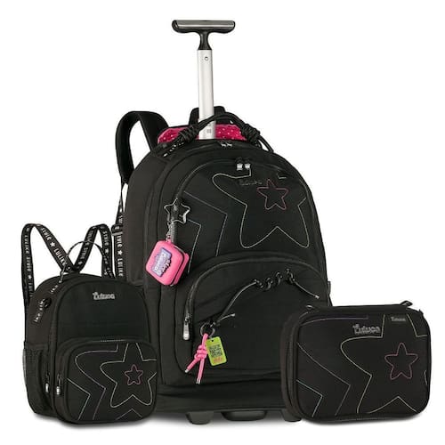 O kit Luluca foi pensado para deixar a volta às aulas cheia de estilo e praticidade. A mochila de carrinho LU27029 é funcional e cheia de personalidade, com matelassê de estrelas coloridas, chaveiros exclusivos e acabamento premium. Além do espaço generoso no compartimento principal, conta com divisórias acolchoadas para notebook e tablet, bolsos frontais para organização e laterais para garrafinhas. Pode ser Utilizado como mochila de carrinho, com rodinhas resistentes e puxador de metal regulável, ou como mochila de costas, com alças acolchoadas escondidas em compartimento traseiro e protetor de rodinhas para não sujar a roupa. A lancheira térmica LU27034 é superversátil, pois pode ser Utilizado de três jeitos: pela alça de mão, de forma transversal ou até mesmo nas costas, como uma mochilinha. Com bolso frontal de fácil acesso, laterais teladas e revestimento interno térmico, mantém os alimentos sempre bem conservados. O kit fica ainda mais completo com o estojo box LU27032, moderno e espaçoso, com capacidade para até 100 lápis ou canetas. Possui 36 elásticos para fixar o material, além de um estojo interno separado com fechamento em zíper, tudo confeccionado em poliéster com matelassê de estrelas. Dimensões aproximadas: Mochila: 48x35x19cm Lancheira: 27x20x12cm Estojo: 22x16x6cm Marca: Não Informado