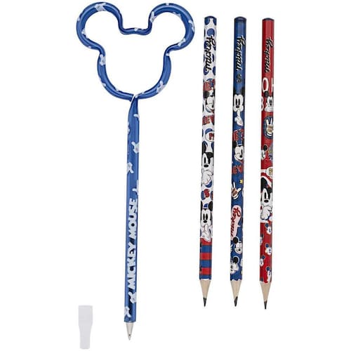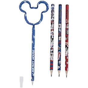 Kit Escolar Mickey 3 Lápis + 1 Caneta O Kit Escolar contém produtos 100% personalizados com imagens do personagem. Contém: - 01 caneta esferográfica com tinta na cor azul e com o topo personalizado no formato da cabeça do Mickey; - 03 lápis pretos; Ean: 7899588004196
