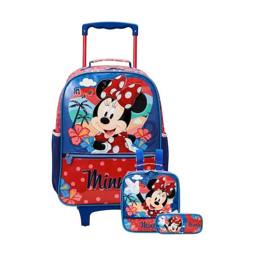 Kit Escolar Minnie Mouse Mochila com Rodas G + Lancheira Térmica + Estojo Triplo A Minnie te espera para muitas aventuras escolares O kit escolar da Minnie Mouse é perfeito para as pequenas aventureiras. Com um design exclusivo e funcional, ele é ideal para levar todos os materiais escolares com facilidade e estilo. Principais características da mochila: Design exclusivo: Estampa da Minnie, a personagem mais famosa da Disney, com detalhes encantadores. Fechamento por zíper: Facilita o acesso aos compartimentos. Alças de mão e puxador: Conforto e versatilidade para carregar da forma que preferir. Rodas resistentes: Facilitam o transporte e garantem durabilidade. Dois compartimentos: Espaço amplo para organizar livros, cadernos e outros materiais. Bolsos laterais: Ideal para guardar garrafinhas ou outros itens pequenos. Principais características da lancheira: Design exclusivo: Estampa da Minnie e com detalhes encantadores. Fechamento por zíper: Facilita o acesso ao compartimento principal. Alças de mão e costas: Versatilidade para carregar da forma que preferir. Faixa de tecido adesivo: Permite acoplar a lancheira na mochila. Isolamento térmico: Mantém os alimentos frescos por mais tempo. Principais características do estojo triplo: Design exclusivo: Estampa da Minnie com detalhes encantadores, deixando o estojo ainda mais exclusivo. Fechamento por zíper: Facilita o acesso aos compartimentos. Três compartimentos: Espaço amplo para organizar lápis, canetas, borrachas e outros materiais. Detalhes em glitter: Deixa o estojo ainda mais divertido e fashion.