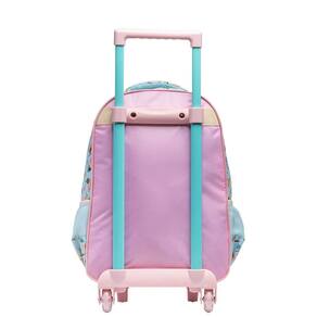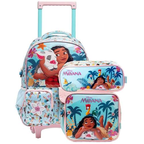1. Mochila com Rodinhas Moana Disney 16 – Aventura, Estilo e Praticidade para Pequenas Exploradoras! -Frente em PVC vincado com glitter; -Dois bolsinhos frontais com tampa; -Bolsos laterais em mesh; -Patch emborrachado; -Detalhe em PVC com glitter; -Zíper tratorado; -Puxadores emborrachados personalizados; -Alça de mão acolchoada; -Carrinho com hastes achatadas e rodinhas em gel; -Material: Poliéster.