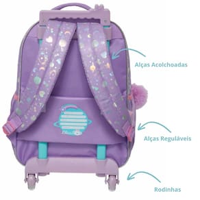 Ideal para transportar os materiais escolares com facilidade e conforto. A mochila possui rodinhas que deslizam suavemente em qualquer terreno, alça rígida e alças acolchoadas, garantindo praticidade para crianças de todas as idades. Feita em poliéster resistente, tem compartimentos organizados e zíperes reforçados, perfeitos para manter os pertences seguros e acessíveis. Seu design lilás com detalhes divertidos e vibrantes conquista de imediato, oferecendo um toque de exclusividade.