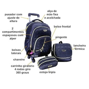 Design único Rodinhas 360 Material de excelente qualidade Confortável e resistente Lancheira termica com alca transversal e estojo