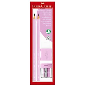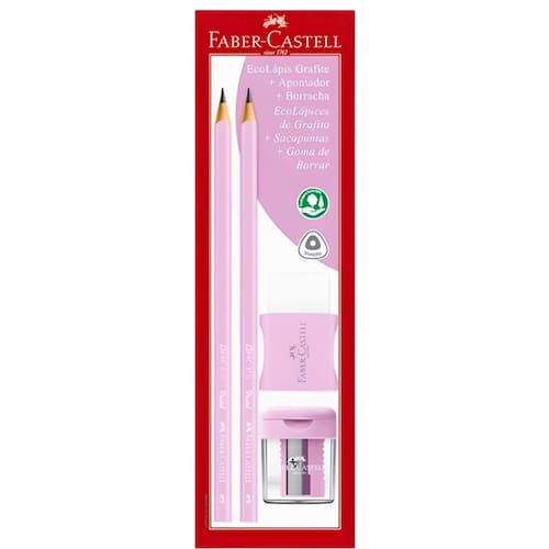O Ecolápis Grafite Combo Faber-Castell, oferece: 2 Ecolápis Grafite Nº 2 + Apontador com depósito + Borracha