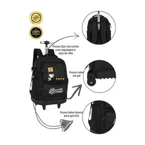 Mochila de rodas: Confeccionada em poliéster Costura reforçada para melhor duração Compartimento para notebook Alça de mão e costas acolchoadas Fechamento em zíper personalizado Carrinho com regulagem de altura e botão para travamento Compartimentos espaçosos 2 bolsos laterais para garrafa Medidas aproximadas do produto: altura: 48cm com as rodinhas e sem a haste levantada . Largura: 30cm. Profundidade: 20cm. Lancheira: Confeccionada em poliéster Isolamento térmico Alça de mão Alça que prende na mochila de rodinhas Design exclusivo Puxadores personalizados Fechamento em zíper Medidas aproximadas: Altura: 18 cm Largura: 8 cm Comprimento: 22 cm Cuidados: - guarde em um local seco e arejado evitando locais úmidos. - evite colocar excesso de peso no produto para não forçar os zíperes e costuras. - proteja os objetos cortantes e/ou pontiagudos evitando o contato direto com o produto. - evitar altas temperaturas. - cores claras poderão manchar quando em contato com outros objetos ou roupas de cores pigmentadas.