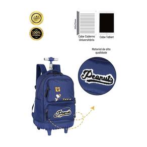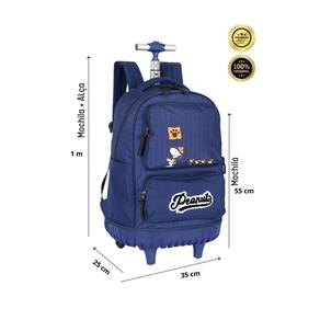 Mochila de rodas: Confeccionada em poliéster Costura reforçada para melhor duração Compartimento para notebook Alça de mão e costas acolchoadas Fechamento em zíper personalizado Carrinho com regulagem de altura e botão para travamento Compartimentos espaçosos 2 bolsos laterais para garrafa Medidas aproximadas do produto: altura: 48cm com as rodinhas e sem a haste levantada . Largura: 30cm. Profundidade: 20cm. Lancheira: Confeccionada em poliéster Isolamento térmico Alça de mão Alça que prende na mochila de rodinhas Design exclusivo Puxadores personalizados Fechamento em zíper Medidas aproximadas: Altura: 18 cm Largura: 8 cm Comprimento: 22 cm