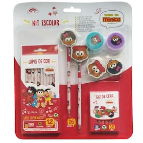 Contém - 01 und - lápis de cor turma da mônica 12 cores 01 und - caixa de giz de cera 8 cores 02 und - lápis grafite 02 und - apontadores redondos. 04 und - borrachas. Enviamos modelos personalizado com vários personagens da turminha mais querida. Kit escolar completo ideal para crianças. O lápis de cor de 12 cores é fabricado em resina plástica, contém corpo confortável e pontas resistentes que não quebram facilmente. É ideal para ser utilizado em projetos artísticos e por estudantes de várias idades. Composição: isenta de pvc; carga inerte e pigmentos atóxicos. Dimensões aproximadas da embalagem a x l: 32 cm x 27 cm