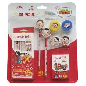 CONTÉM - 01 und - Lápis de cor Turma da Mônica 12 cores 01 und - Caixa de giz de cera 8 cores 02 und - Lápis grafite 02 und - Apontadores redondos. 04 und - borrachas. Enviamos modelos Personalizado com vários personagens da turminha mais querida. Kit escolar completo ideal para crianças. O lápis de cor de 12 cores é fabricado em resina plástica, contém corpo confortável e pontas resistentes que não quebram facilmente. É ideal para ser Utilizado em projetos artísticos e por estudantes de várias idades. Composição: isenta de PVC; carga inerte e pigmentos atóxicos. Dimensões aproximadas da embalagem A x L: 32 cm x 27 cm