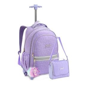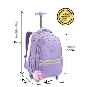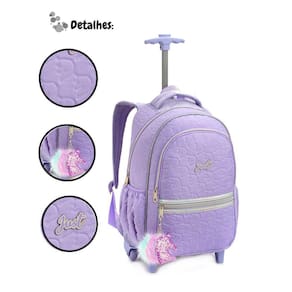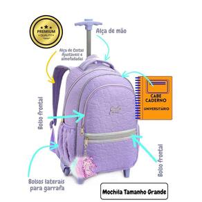 Produzida em poliéster; Possui alças para costas macias e confortáveis; Possui 2 bolsos laterais, 2 frontais e 1 divisão grande; Zíperes com puxadores reforçados; Rodinhas produzidas em pvc gel de altíssima resistência; Puxador do carrinho produzida em alumínio e pvc; Estampa estilizada; Alça para mão;
