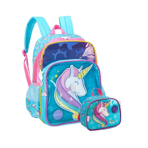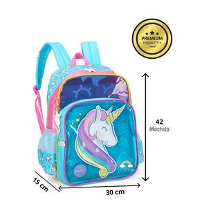 Mochila de Costas Unicórnio Luxo Produzido em poliéster 1 divisão grande 2 bolsos laterais em redinha Alças acolchoadas de Costas 1 bolso frontal Ziperes com puxadores personalizados Estampa estilizada