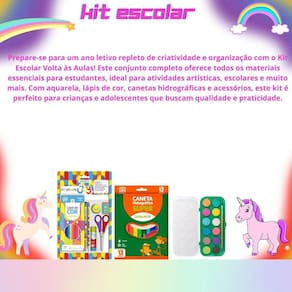 O Kit Escolar Volta às Aulas é a solução perfeita para estudantes que desejam praticidade, criatividade e organização em suas atividades. Com itens de alta qualidade e design funcional, este kit garante uma experiência produtiva e divertida tanto em sala de aula quanto em casa.