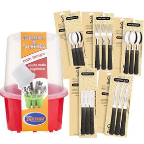 Kit escorredor de talher com talheres Base-material-type aço inox e carbono Brand santana Marca simonaggio Prepare-se para elevar sua experiência gastronômica com nosso conjunto de talheres de alta qualidade seja para refeições cotidianas ou ocasiões especiais, este conjunto é indispensável para quem busca praticidade, elegância e durabilidade em cada garfada. Fabricados com aço inox de primeira qualidade e polipropileno resistente, nossos talheres não só garantem uma longa vida útil, mas também adicionam um toque de sofisticação à sua mesa. Com um design ergonômico e acabamento impecável, cada peça foi cuidadosamente projetada para proporcionar conforto e precisão ao manusear. Sinta a diferença em cada refeição além disso nosso conjunto conta com um escorredor de talheres com tampa, chega de perder tempo secando talheres lavados nosso escorredor é a solução perfeita para manter seus utensílios organizados e prontos para uso em segundos.Especificações do produtomarca talheres: simonaggiomarca escorredor de talheres: santanamodelo: kit para banheirodimensões porta talherer axlxc : 26,5x9x13,5cmpeso: 2300gcores: pretoitens inclusos: 1- porta talheres; 1-jg colheres ; 1- jg garfos; 1- jg espatulas; 1- jg facas p/carne; 1- jg colheres chautilizaí distribuidoraa utilizai foi criada para facilitar o dia a dia de seus clientes. Estamos há 26 anos no mercado e acreditamos que um mundo melhor começa pela nossa casa e queremos fazer parte de cada bom momento do seu dia a dia. Prezando pelo atendimento personalizado, humanizado, buscando excelência na prestação dos serviços com qualidade, entrega rápida, e preços competitivos e produtos com . Marca: Não Informado