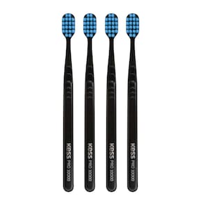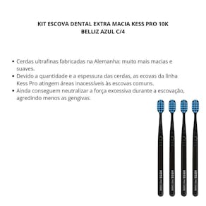 Escova dental com cerdas feitas de um material diferenciado, importado da Alemanha, que é tão fino quanto um fio de cabelo! Por isso, são ainda mais macias que as tradicionais, que tem cerdas de nylon.E o resultado disso é LIMPEZA EFICIENTE e CONFORTÁVEL!Devido a quantidade e a espessura das cerdas, as escovas da linha Kess Pro atingem áreas inacessíveis às escovas comuns. As cerdas especiais ainda conseguem neutralizar a força excessiva durante a escovação, agredindo menos as gengivas.