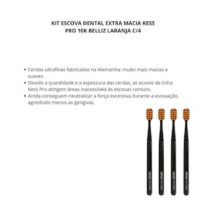 Escova dental com cerdas feitas de um material diferenciado, importado da Alemanha, que é tão fino quanto um fio de cabelo! Por isso, são ainda mais macias que as tradicionais, que tem cerdas de nylon.E o resultado disso é LIMPEZA EFICIENTE e CONFORTÁVEL!Devido a quantidade e a espessura das cerdas, as escovas da linha Kess Pro atingem áreas inacessíveis às escovas comuns. As cerdas especiais ainda conseguem neutralizar a força excessiva durante a escovação, agredindo menos as gengivas.