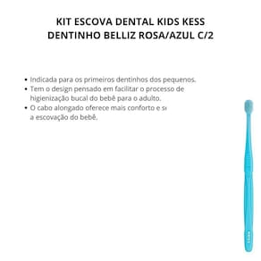 Com cabeça pequena e cerdas extra macias que são gentis e delicadas com a gengiva das crianças, a Escova Kess Dentinho conta com design especial para auxiliar os adultos na hora de escovar os dentes dos pequenos. O cabo alongado oferece mais conforto e segurança durante a escovação do bebê. Além de contar com um porta escova!
