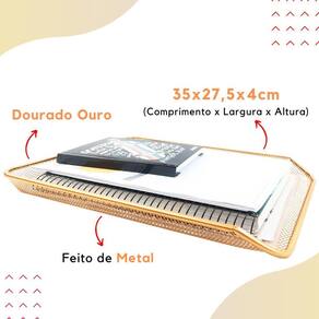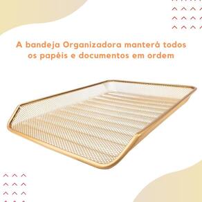 O Kit escritório dourado ouro é composto por uma bandeja organizadora simples e um organizador de mesa com 3 partições. Ambos os itens são feitos de metal resistente e possuem um acabamento na cor dourado ouro, que adiciona um toque de elegância ao ambiente.