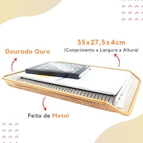 O Kit escritório dourado ouro é composto por uma bandeja organizadora simples e um organizador de mesa com 3 partições. Ambos os itens são feitos de metal resistente e possuem um acabamento na cor dourado ouro, que adiciona um toque de elegância ao ambiente.