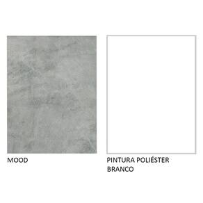 A mesa possui acabamento em cinza Mood no tampo e o gaveteiro tem acabamento branco. Ambos são feitos em Pintura Poliéster ecológica com 7 camadas de proteção.