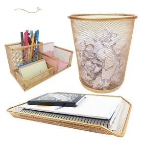 Kit organizadores de escritório composto por: - 01 lixeira aramada dourado ouro 10l - 01 bandeja organizadora simples dourado ouro - 01 organizador de mesa com 3 partições dourado ouro