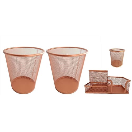 Kit escritório rose gold composto por: - 02 lixeira aramada rose gold - 01 kit organizador de mesa com 3 partições - 01 porta caneta, lápis rose gold