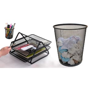 Kit escritório preto composto por: - 01 porta caneta, lápis preto - 01 lixeira aramada preto - 01 bandeja dupla de mesa escritório para documentos
