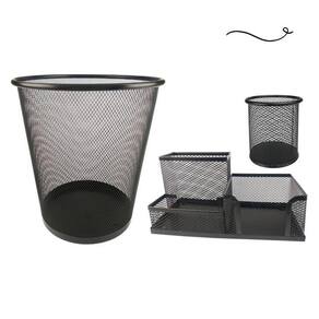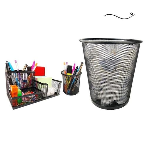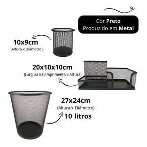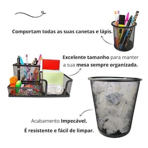 Kit escritório organizador de mesa lixeira porta caneta lápis preto Kit escritório organizador de mesa, lixeira e porta caneta lápis preto Para quem gosta de ter tudo sempre à mão, com agilidade e praticidade. Kit completo de organizador, porta canetas e lixeira de escritório é ideal para você.Com eles, você vai evitar a perda de tempo procurando os itens de que precisa e que usa com frequência. Tudo estará a sua mão. Kit escritório preto composto por:- 01 organizador de mesa escritório preto com 3 partições - 01 porta caneta, lápis preto - 01 lixeira aramada preto Cor: pretoMaterial: metal - organizador de mesa escritório tamanho: 20x10x10cm largura x altura x comprimento - porta caneta, lápis tamanho: 10x9cm altura x diâmetro - lixeira tamanho: 27x23,5x18,5cm altura x diâmetro da boca x diâmetro da base Marca: Markys Store