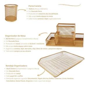 Kit escritório porta caneta, organizador de mesa, bandeja organizadora dourado Kit escritório dourado ouro Para quem gosta de ter tudo sempre à mão, com agilidade e praticidade. Kit de organizadores de escritório é ideal para você.Com eles, você vai evitar a perda de tempo procurando os itens de que precisa e que usa com frequência. Tudo estará a sua mão. Kit organizadores de escritório preto composto por:- 01 bandeja organizadora simples dourado ouro- 01 organizador de mesa com 4 partições dourado ouro- 01 porta caneta dourado ouro Cor: dourado ouroMaterial: metal Tamanhos:- porta caneta tamanho: 10x9cm altura x diâmetro - bandeja organizadora de mesa tamanho: 4x27,5x35cm altura x largura x comprimento - organizador de mesa com 4 partições dourado tamanho: 20x10x10cm largura x comprimento x altura Marca: Markys Store