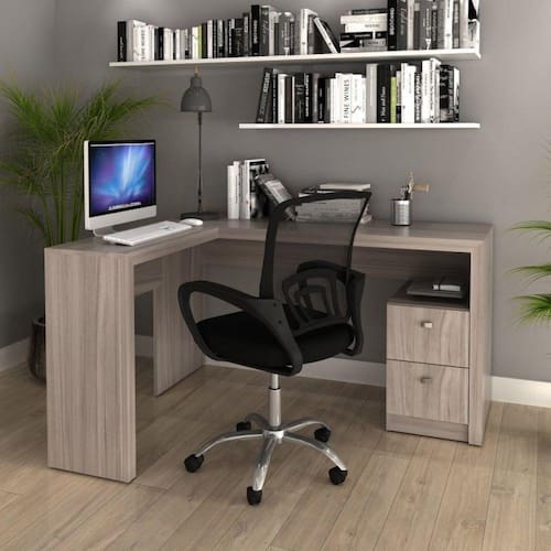 Mesa Escritório de canto Tecnomobili ME4129, possui 2 gavetas com amplo espaço para armazenar documentos, objetos pessoais e/ou acessórios, material em MDP, acabamento em BP, possui costas na cor do móvel. A cadeira tem estrutura em poliuretano de altíssima qualidade, que proporciona muito mais resistência, mesmo com o passar dos anos. O acabamento em verniz deixa o móvel mais bonito e dá mais destaque a decoração de toda a casa. Essa cadeira tem design versátil, assento confortável e vem com kit de montagem, para tudo ficar mais rápido e prático. Ela suporta até 120 kg de peso máximo, que dá mais tranquilidade ao sentar e tem 4 pés com rodízios em PU que não arranham o piso do cômodo. Acabamento: BP Altura do Conjunto: 85 cm Ambiente: Escritório Ambiente Principal: Escritório Cor: Carvalho/Preto Informação Complementar: 1x Mesa para Escritório em L 2 Gavetas Me4129 Carvalho Largura: 135,8 cm Altura: 74,5 cm Peso: 32,4 kg Profundidade: 113 cm Necessita Montagem: Sim