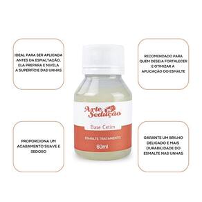 Contém: 01 - Esmalte de Tratamento Base Cetim, 60ml, Arte Sedução 01 - Frasco de Vidro Recarregável, 10ml O kit perfeito para quem busca praticidade, economia e acabamento Contendo um frasco de vidro transparente, resistente e reutilizável, com pincel de cerdas macias que é ideal para armazenar e aplicar bases, esmaltes ou óleos para cutículas, e a Base Cetim que proporciona um acabamento acetinado e é perfeita para fortalecer e proteger as unhas naturais, podendo também ser Utilizado sozinha, com uma secagem rápida e fórmula de alta qualidade. Em um refil de 60ml, a Base Cetim gera um excelente custo-benefício, já que permite que o frasco seja recarregado várias vezes. Um kit com qualidade ideal para manicures ou para uso doméstico. Características Principais: - Esmalte de tratamento Base Cetim de 60ml; - Frasco recarregável com capacidade de 10ml; - Tampa com pincel aplicador embutido, com cerdas macias e bem distribuídas; - Base que proporciona um acabamento acetinado, fortalece e protege as unhas naturais; - Secagem rápida e fórmula de qualidade; - Frasco de vidro transparente que facilita a visualização do conteúdo; - Embalagem econômica de 60ml, ideal para recarregar o frasco diversas vezes; - Ideal para manicures ou uso pessoal; - Excelente custo-benefício. Marca: Não Informado Ean: 7908639613758
