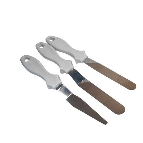 Espátulas de cabo cor BRANCA de modelos diferentes para que possa modelar da forma que desejar. Confira e adquira o seu Medidas aproximadas centímetro : Tipo1: Comprimento: 22cm. Largura: 2,5cm. Largura da ponta: 0,5cm. Tipo2: Comprimento: 23,5cm. Largura: 2,5cm. Tipo3: Comprimento: 22cm. Largura: 2,5cm. Ficha técnica - Cor: Inox - Cor: Branco Ean: 7905522772721