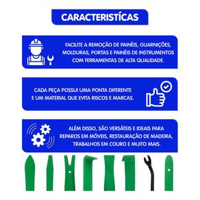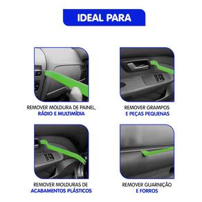 CARACTERÍSTICAS: - Pontas Diferenciadas: Cada ferramenta possui uma ponta única, facilitando a remoção de diversos componentes. - Material de Qualidade: Confeccionadas em nylon, evitam arranhões e marcas em superfícies delicadas. - Versatilidade: Perfeitas para desmontar painéis e guarnições do carro, além de serem úteis em reparos de móveis, couro e restaurações.